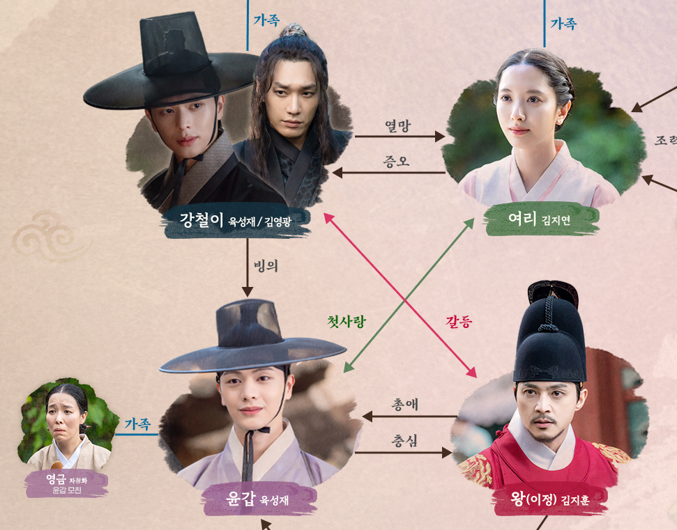 - 로맨스: 윤갑과 여리의 첫사랑 재회, 강철이의 존재로 인한 삼각 구도가 긴장감을 더합니다.