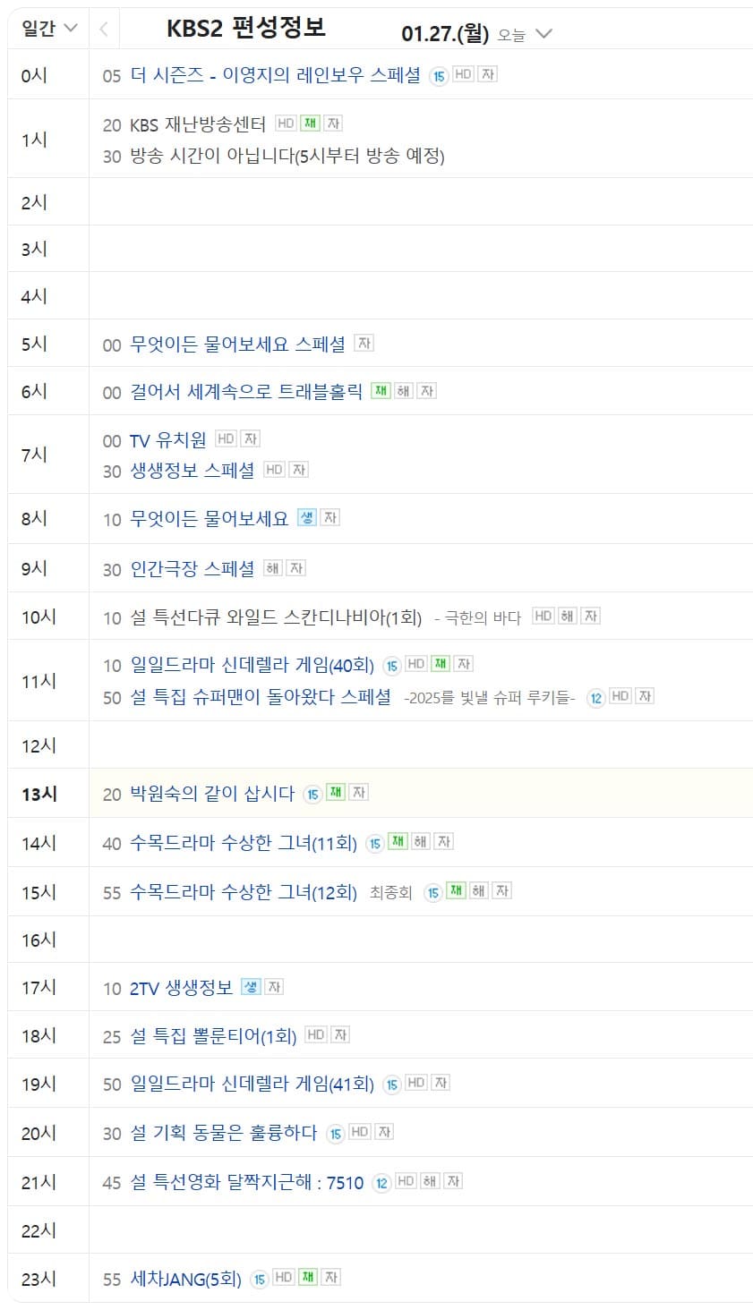 1월 27일 월요일 설 연휴 지상파 tv편성표