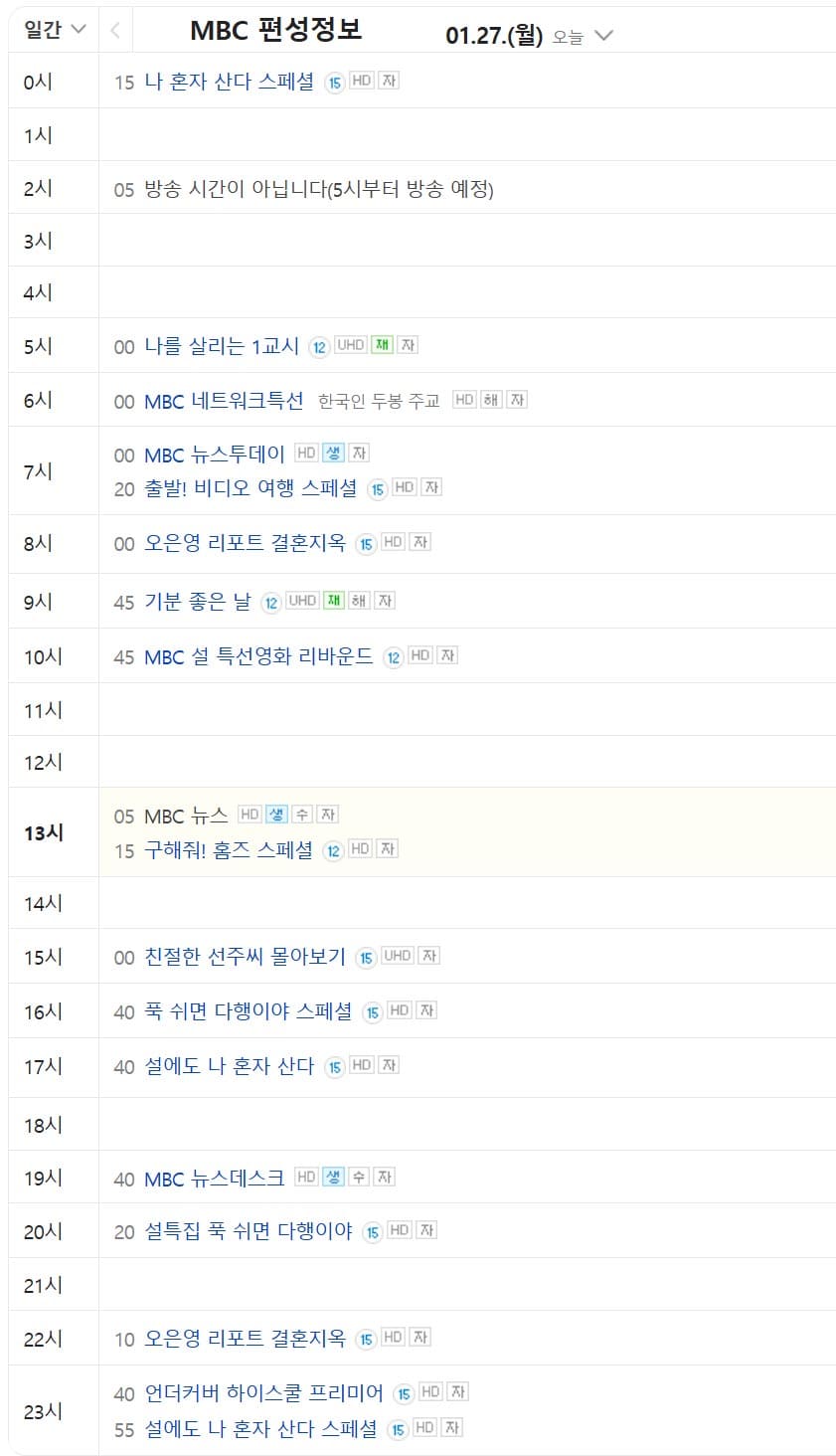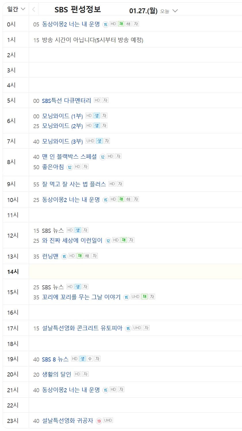 | 1월 28일 월요일 설 연휴 지상파 tv편성표 (0) | 2025.01.27 |