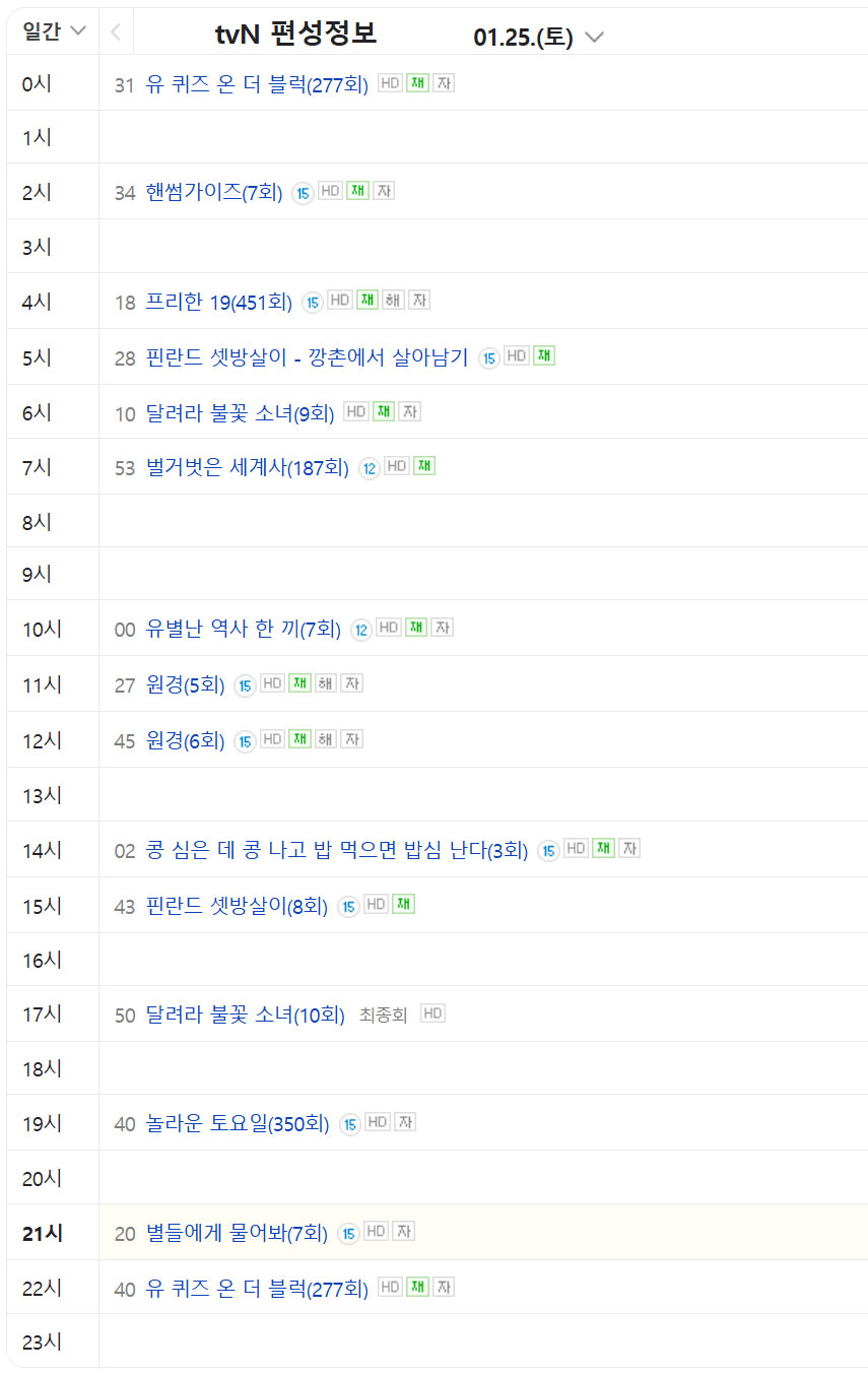 1월 25일  tvn 편성표