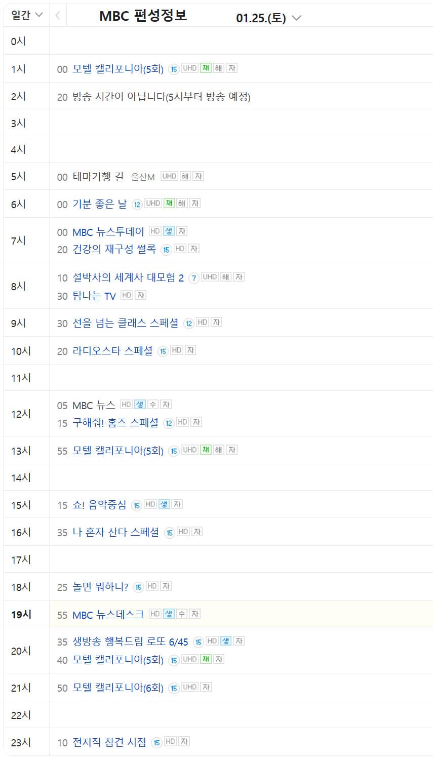 1월 25일 MBC 편성표