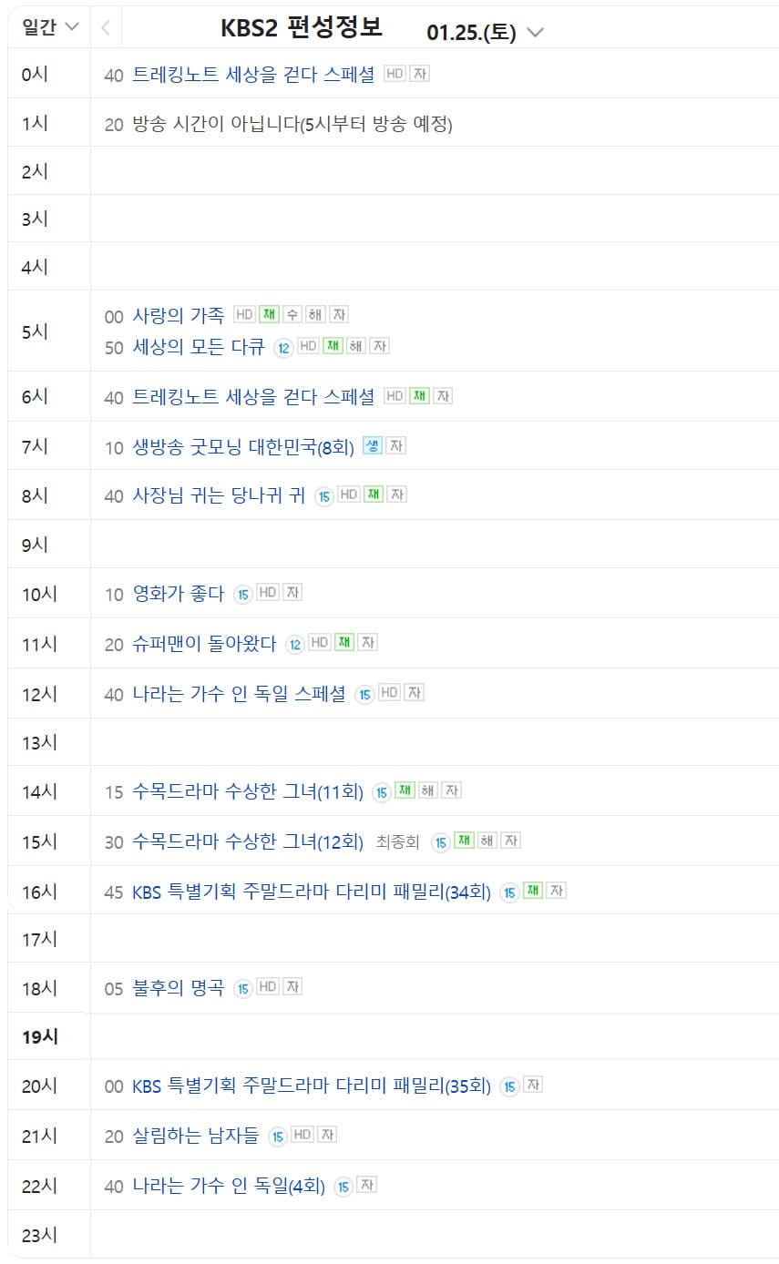 1월 25일 KBS2 편성표