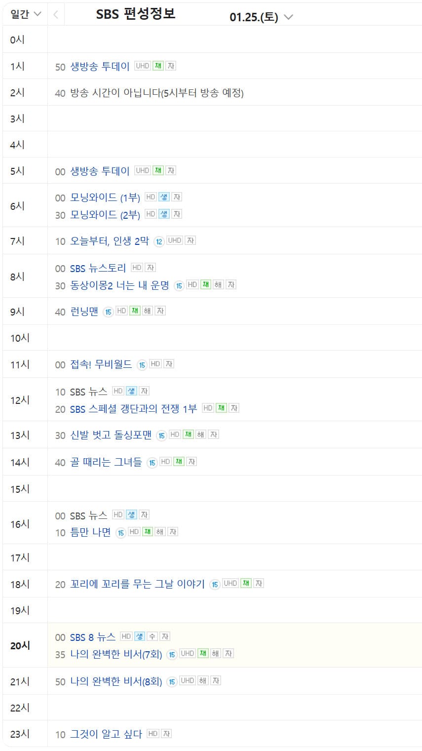 1월 25일 SBS 편성표